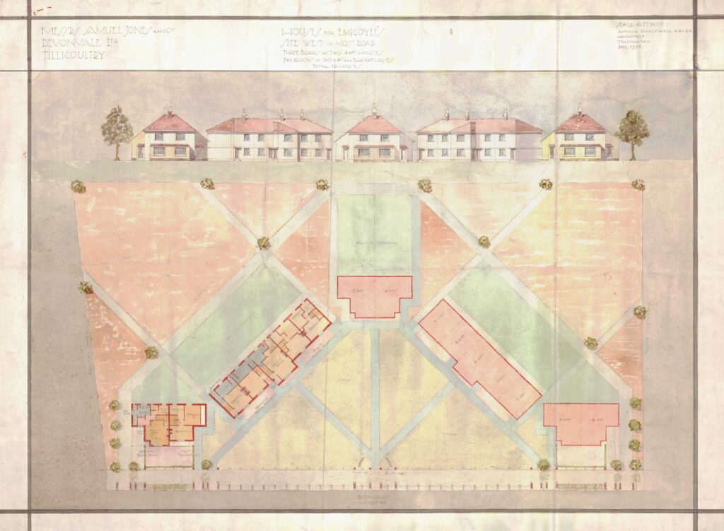 Garden Village Planning Begins: Bracewell begins work on an ambitious “garden suburb” masterplan near the Devonvale mills. His designs feature cottage-style workers’ homes, a community hall, landscaped recreation grounds, tennis courts, and bowling pavilions. These amenities reflect contemporary Garden City ideals and demonstrate the firm’s early commitment to healthy, socially integrated living environments. This village plan became the practice’s first major project and helped establish its long-term focus.