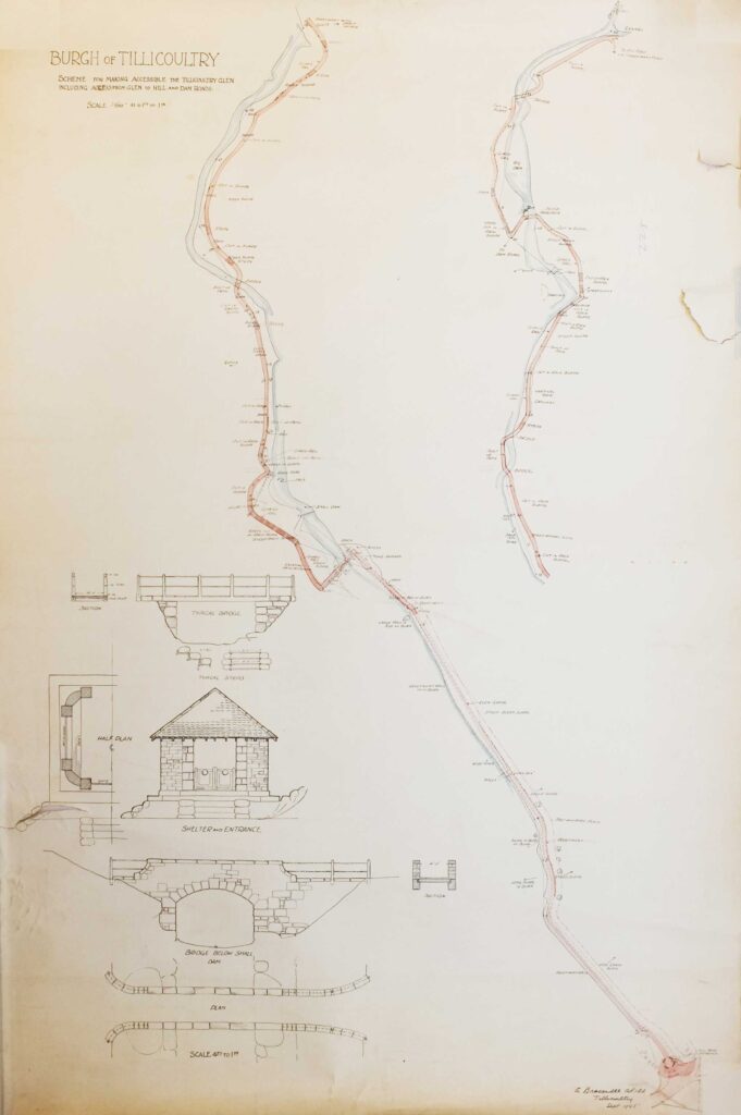 Tillicoultry Glen formally opened by Arthur Bracewell’s widow Mrs Janet Bracewell and commemorated by a plaque on the cairn at Glenfoot