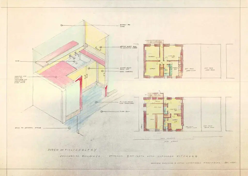 Shillinghill Housing: Bill designs a series of white-rendered modernist homes on Shillinghill, Upper Mill Street, for Tillicoultry Burgh Council.
