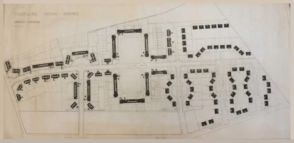 Arthur G. Bracewell designs a distinctive row of sloped, single-storey council houses for elderly residents near Fir Park Academy. The stepped plan and simplified modern forms reflected post-war housing innovation while providing practical, accessible living environments.