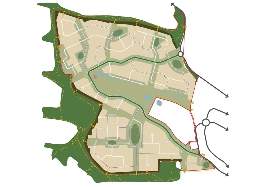 The identity of the new community is formed by the landscape strategy by creating pockets of development, each with a park, access to the wider movement network and a visual connection to the existing tree belt. The residential areas prioritise Designing Streets and the creation of a sense of place and community.